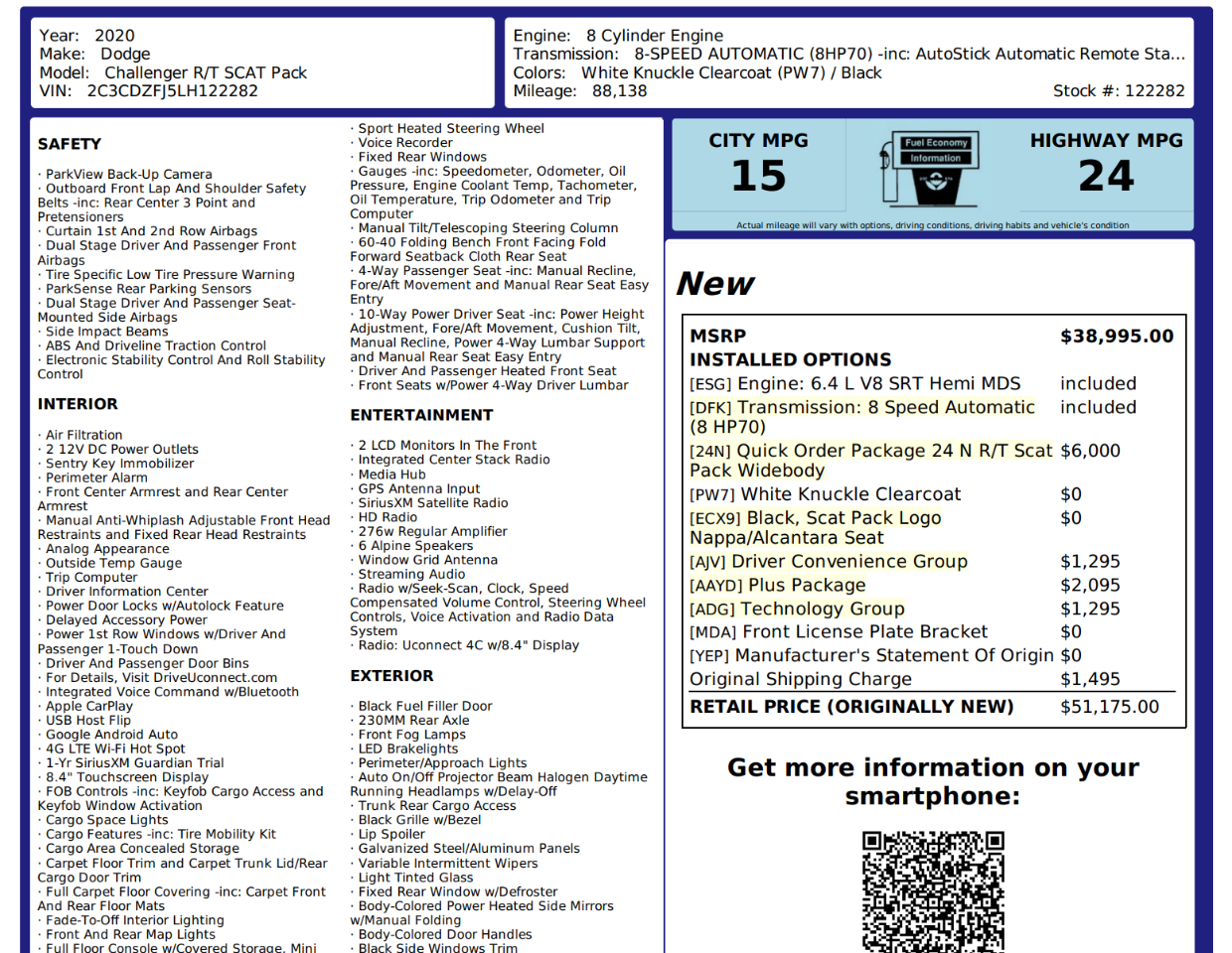 This Widebody Scat Pack is equipped with over $10,000 in factory options, including the coveted factory Widebody kit, Brembo high-performance brakes, and Factory Widebody Competition Suspension for sharp handling and aggressive stance. Inside, enjoy a premium black leather/Alcantara Scat Pack interior with leather dash — built for both comfort and performance.Â