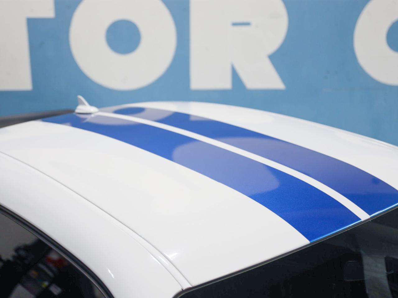 Exterior: White Knuckle Clearcoat with Blue Racing Stripes — bold and collectible